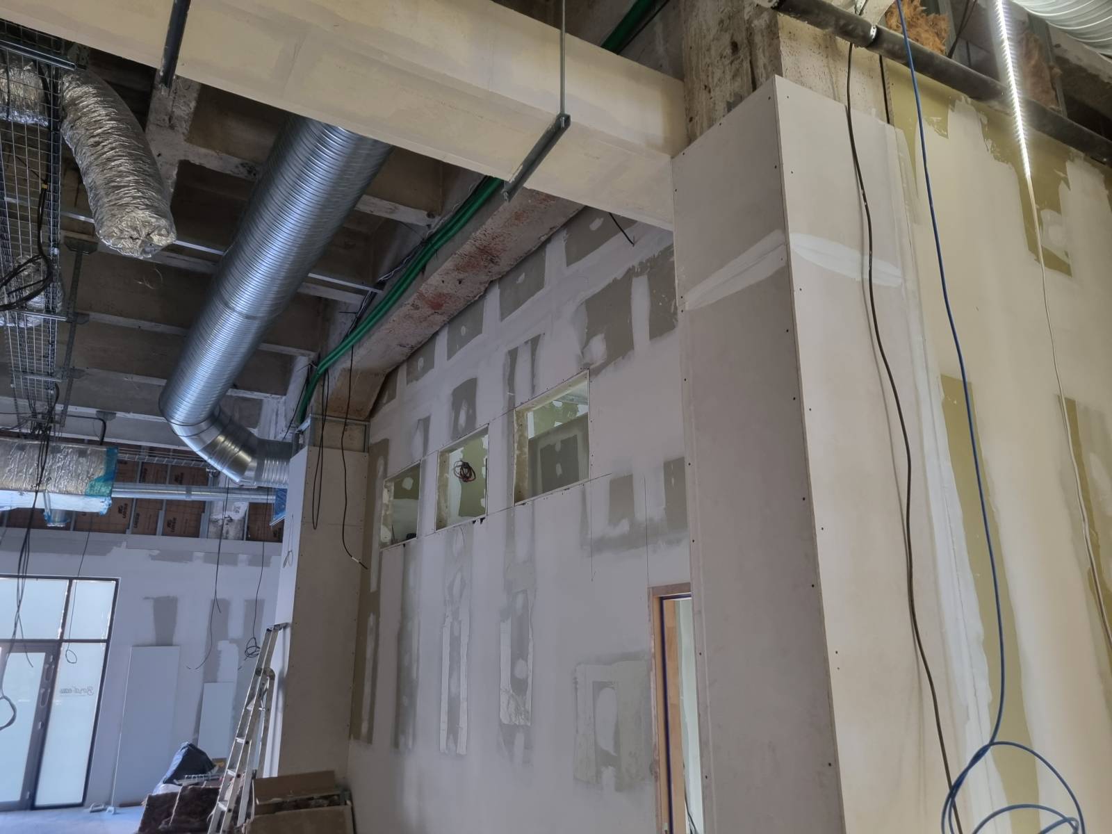 Pour cela, nous avons mis en place des cloisons (3 palettes de B18 pour 200M²) sur ossature 98/62 pour garantir un coupe feu de 1 heure (EI60).